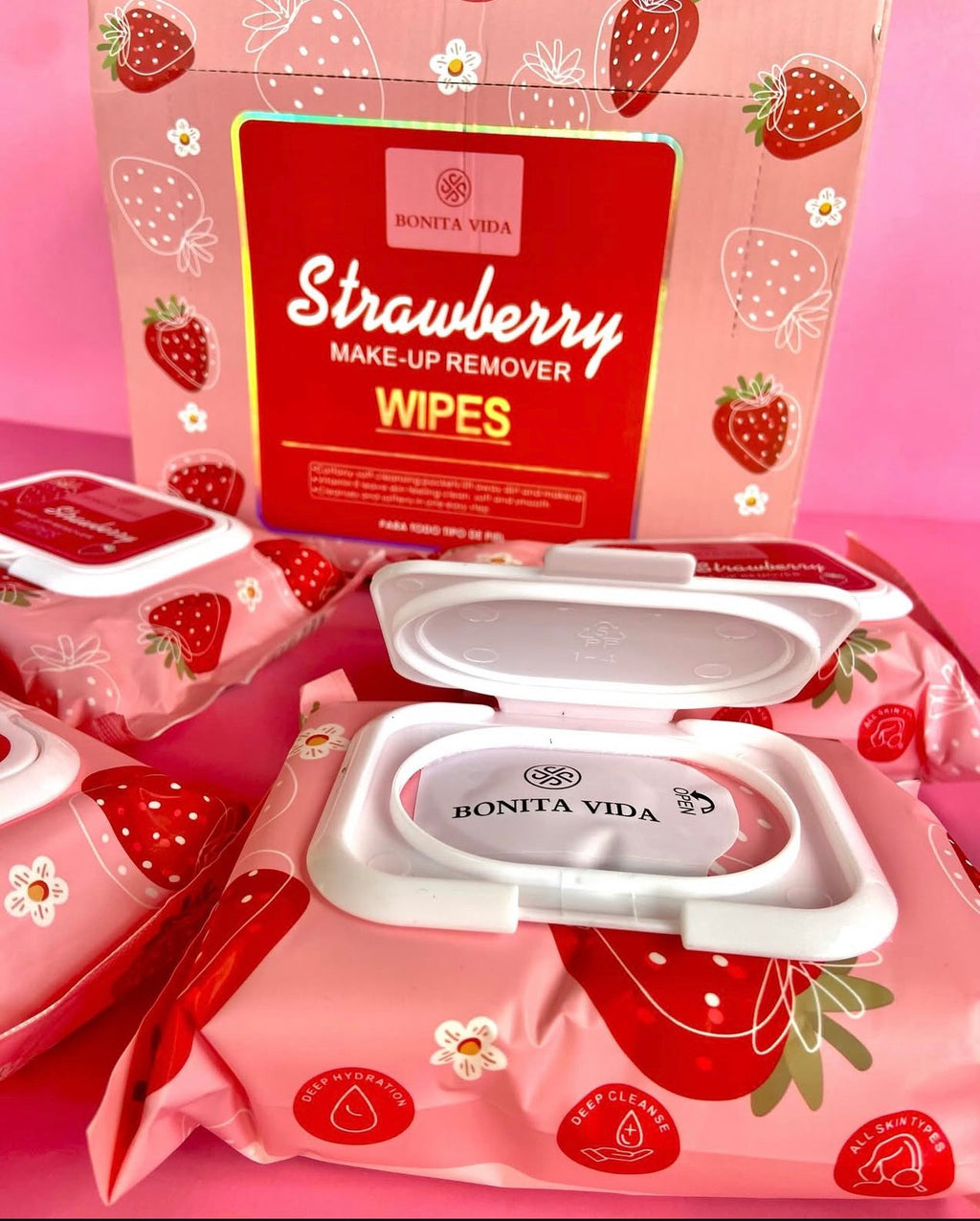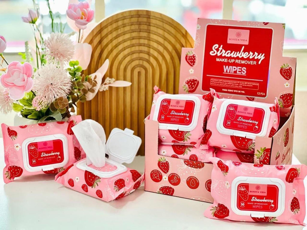 Las Strawberry Make-Up Remover Wipes de Bonita Vida son toallitas desmaquillantes prácticas y suaves, ideales para una limpieza rápida y efectiva.